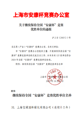 近日,寶綠公司收到關(guān)于上海市安康杯競(jìng)賽辦公室下發(fā)的《關(guān)于繼續(xù)保持全國(guó)“安康杯”競(jìng)賽優(yōu)勝單位的通報(bào)》,公司已連續(xù)12年榮獲全國(guó)“安康杯”競(jìng)賽優(yōu)勝單位榮譽(yù)稱(chēng)號(hào)。
